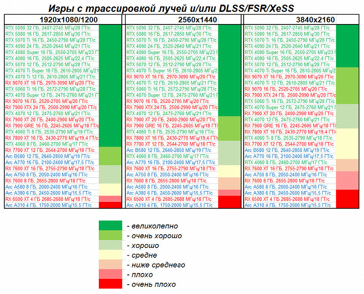 В играх с активной трассировкой лучей и разными видами апскейлинга (FSR/XeSS) Radeon RX 9070 XT находится на одном уровне с GeForce RTX 4070 Ti, чуть выше GeForce RTX 4070 Super и весьма существенно опережает флагмана предыдущего поколения Radeon RX 7900 XTX. В разрешениях до 2.5K включительно можно получить хороший комфорт в играх на высоких настройках графики, а во многих играх приемлемая производительность будет и в 4K, однако в некоторых играх использование трассировки лучей надо сочетать с технологиями динамического масштабирования).