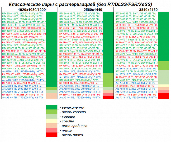 В классических играх Radeon RX 9070 XT по производительности выходит на один уровень с GeForce RTX 4080, чуть обгоняет GeForce RTX 4070 Ti Super и Radeon RX 7900 XTX и чуть отстает от GeForce RTX 5070 Ti. Это позволяет получить высокий уровень комфорта в играх на максимальных настройках качества во всех разрешениях до 4K включительно.